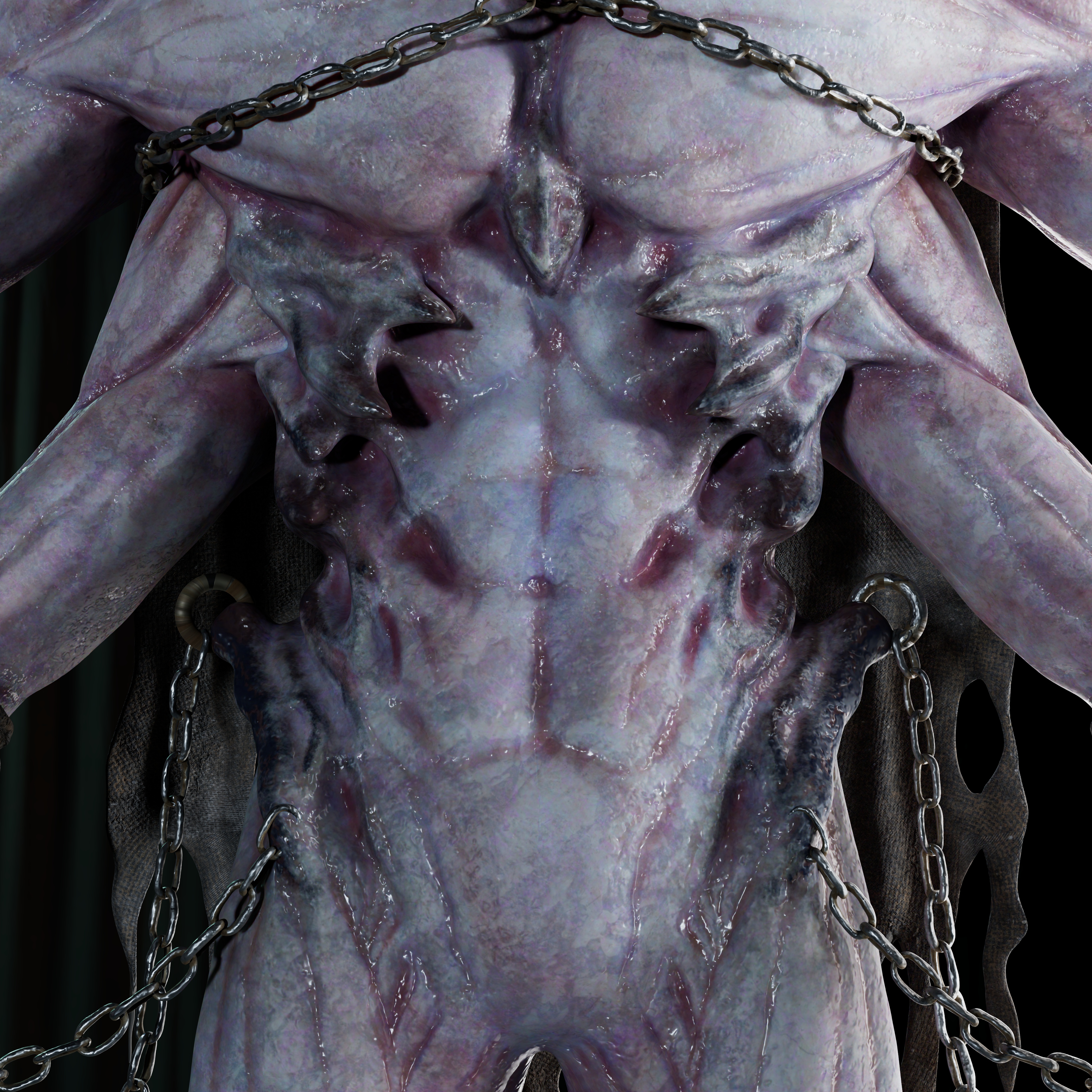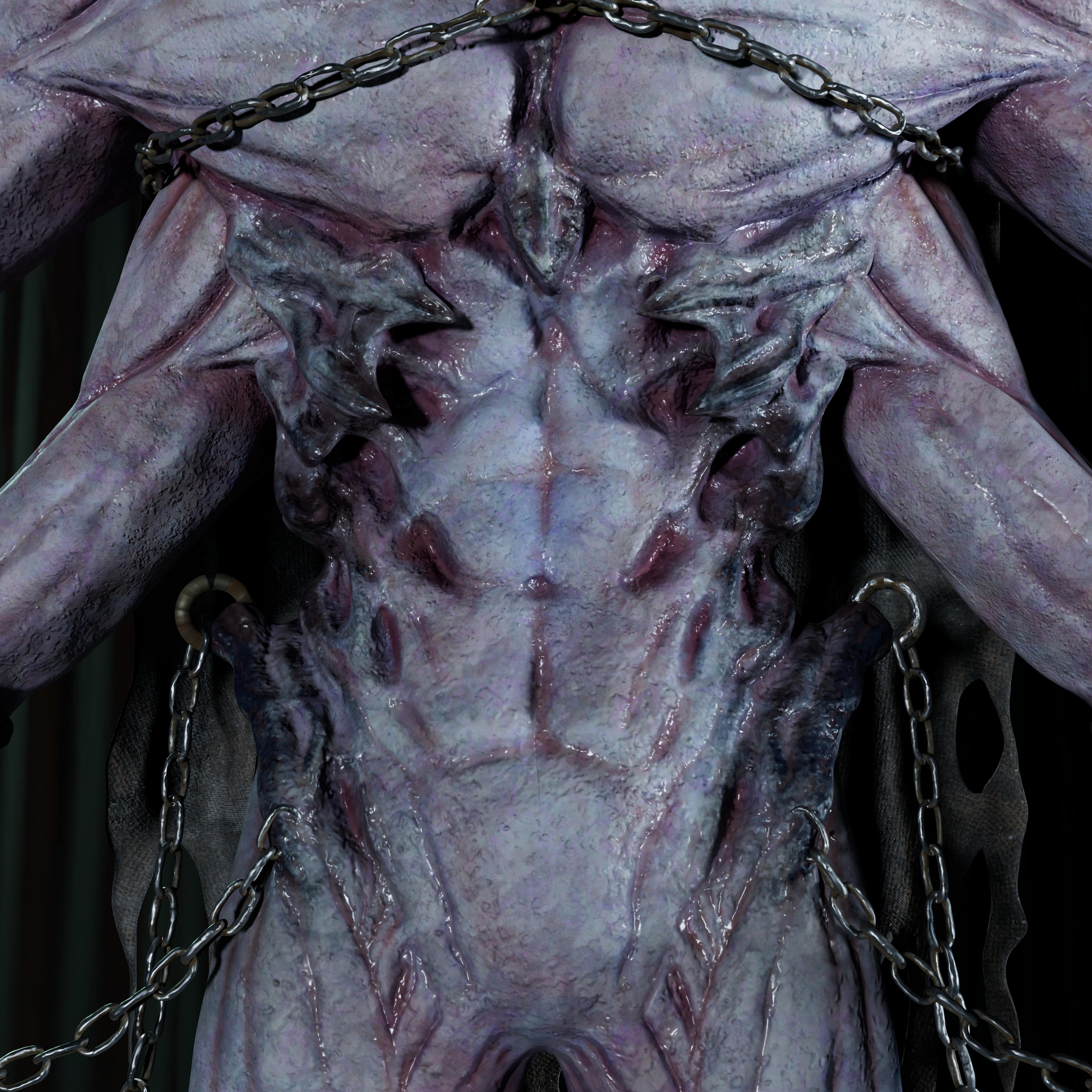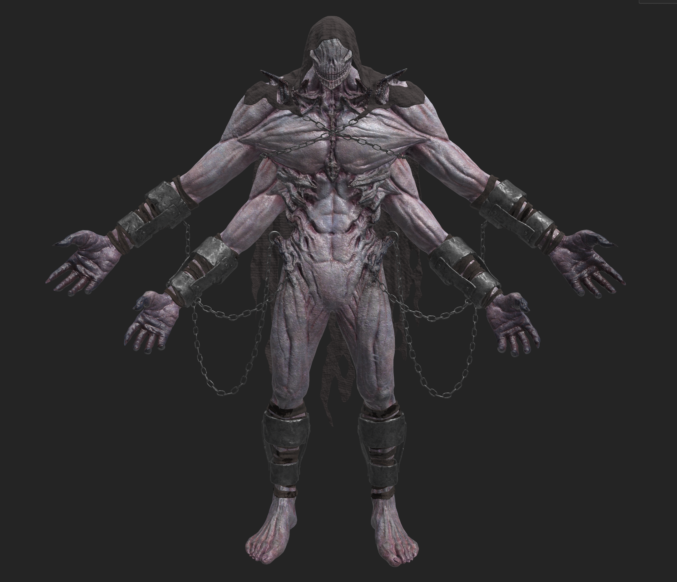 Bringing the materials into Maya allowed me to further refine the look and align it with the character’s intended mood. By adjusting roughness values and color correcting the base colors, I was able to achieve a cooler, more moist and atmospheric tone that enhanced the character’s overall presence.