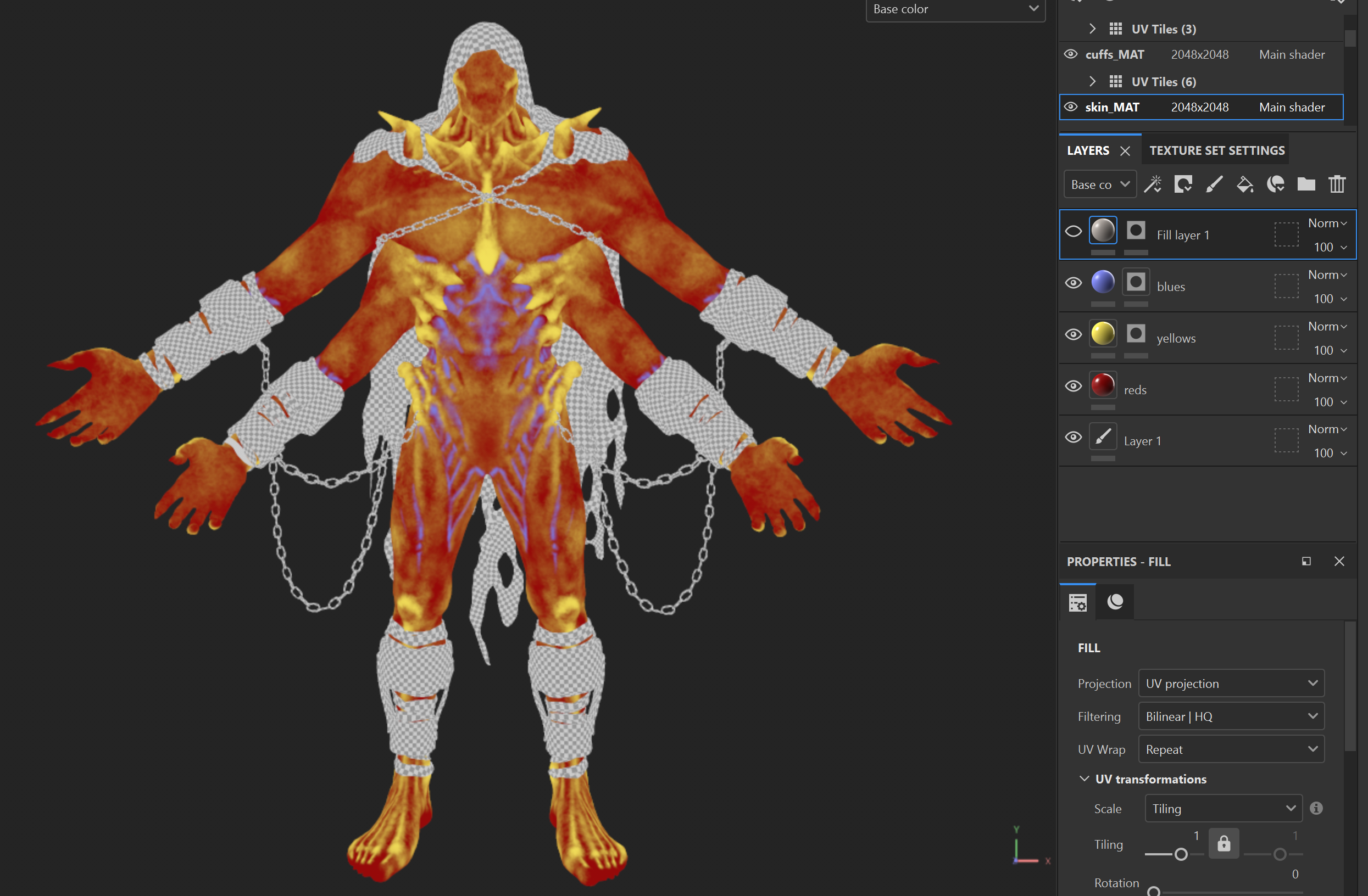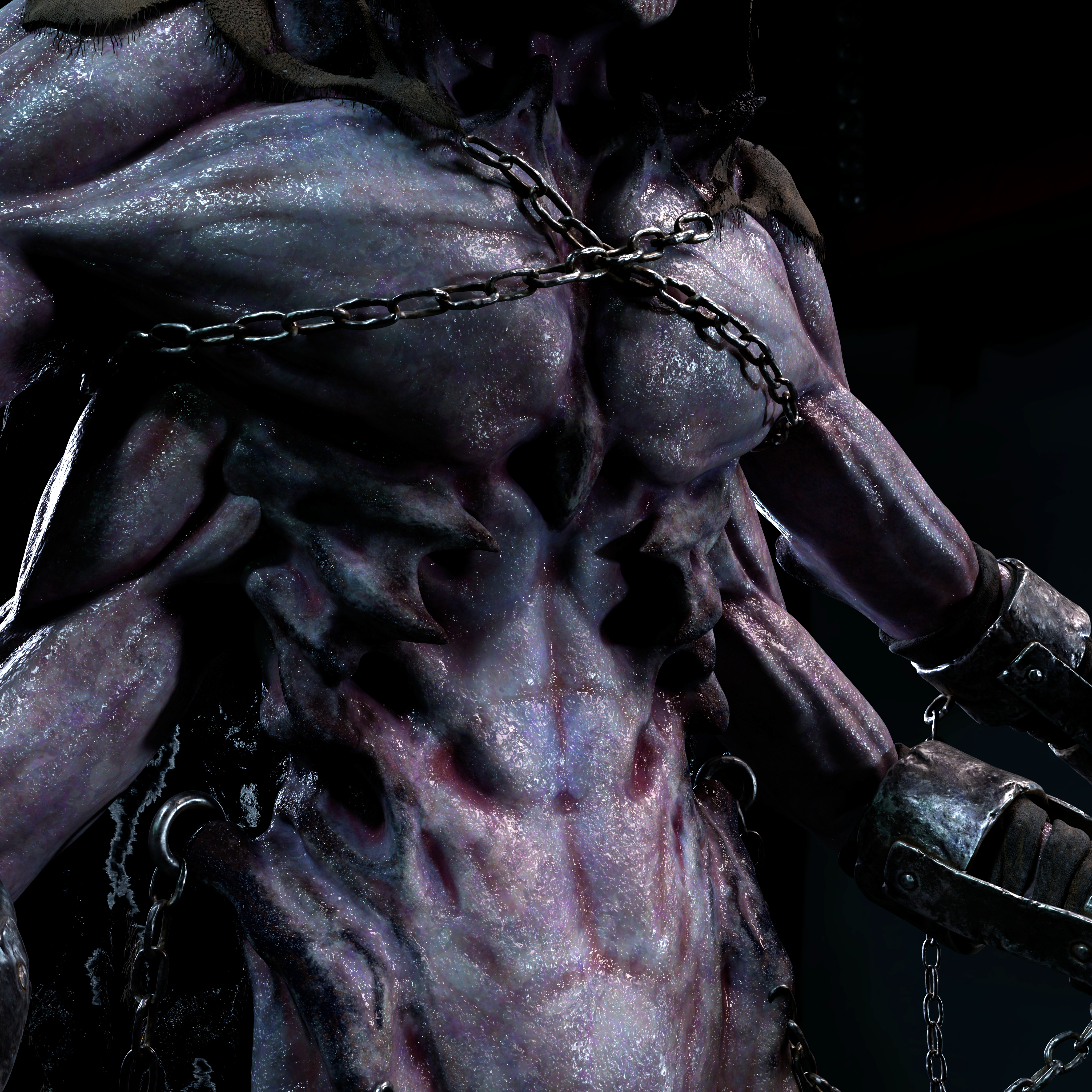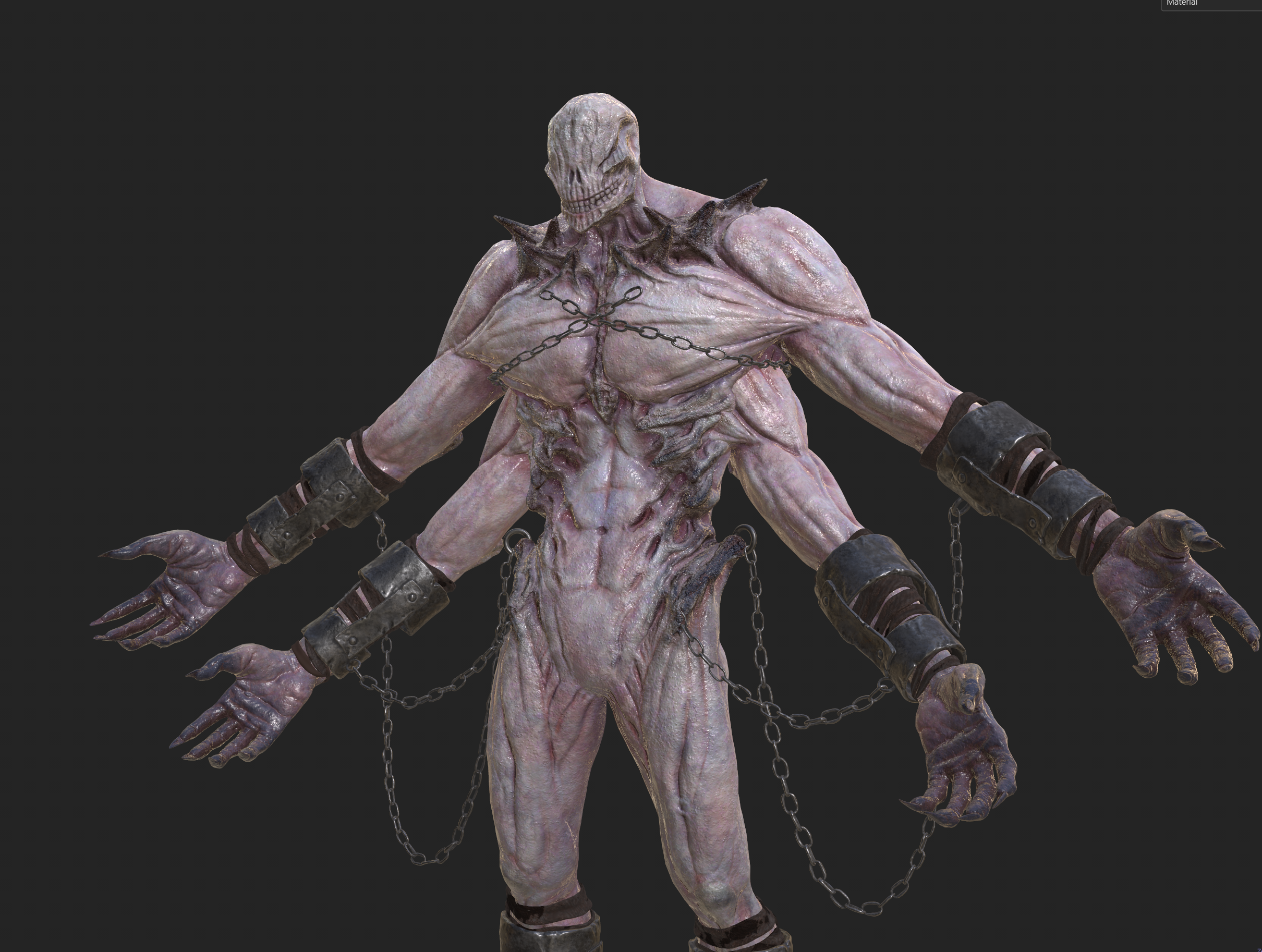 Bringing the materials into Maya allowed me to further refine the look and align it with the character’s intended mood. By adjusting roughness values and color correcting the base colors, I was able to achieve a cooler, more moist and atmospheric tone that enhanced the character’s overall presence.
