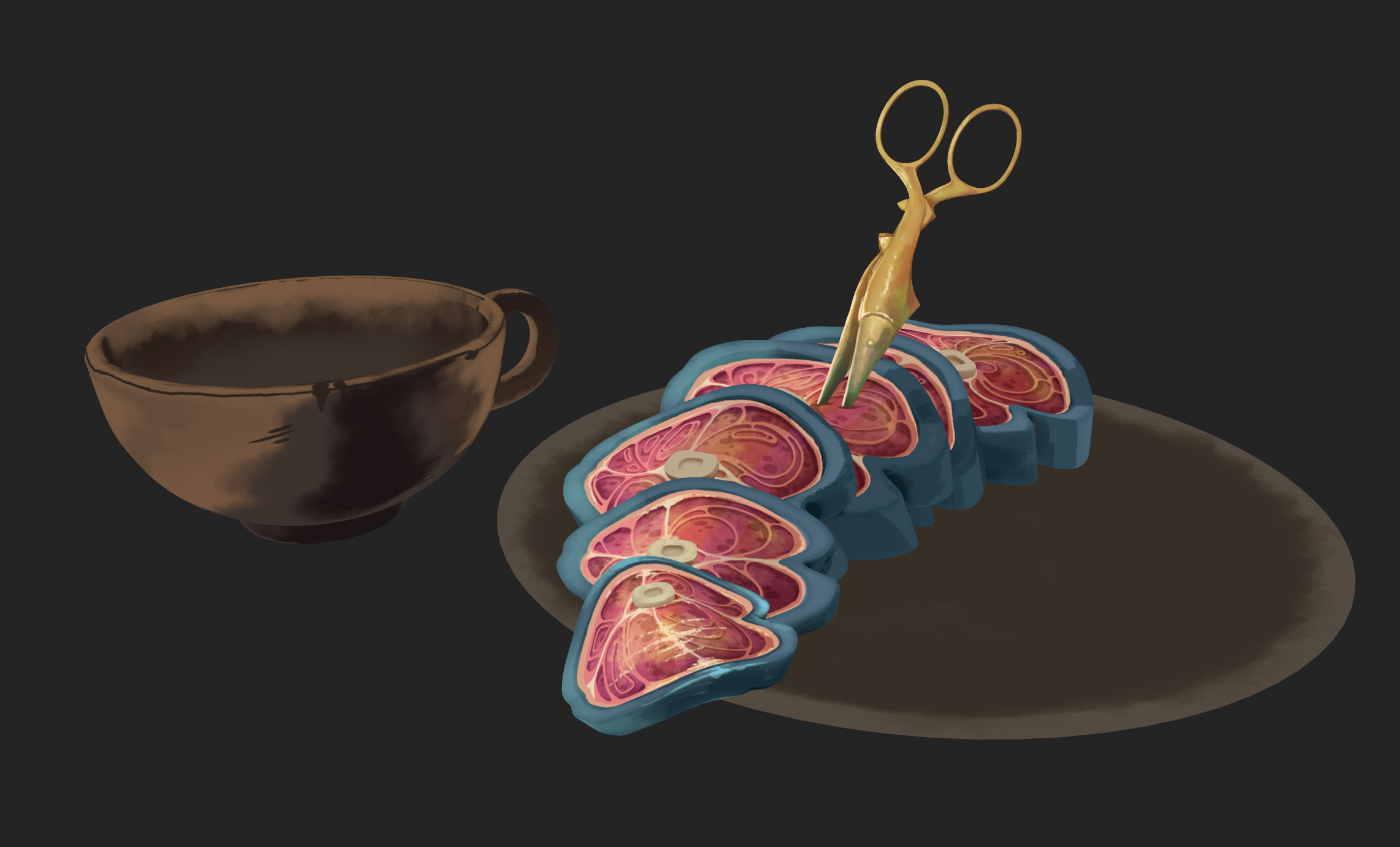 A stylized desk depicting a grungy, fish themed, 3d model environment.